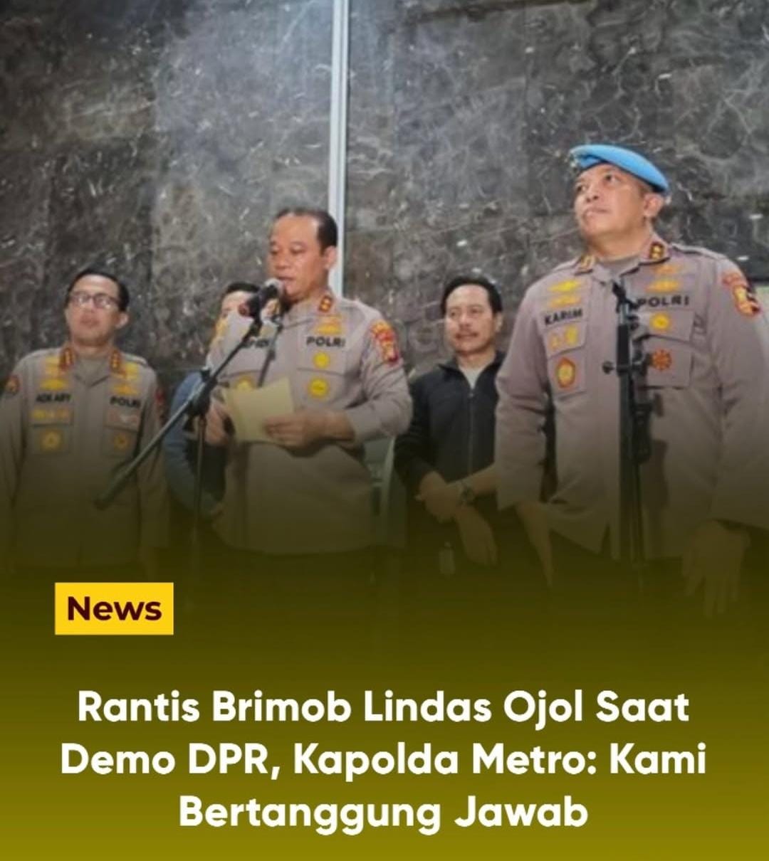 Jakarta | – Kapolda Metro Jaya Irjen Asep Edi Suheri menyampaikan belasungkawa atas meninggalnya seorang pengemudi ojek online (ojol) karena dilindas kendaraan taktis (rantis) milik Brimob di kawasan Jakarta Pusat, Kamis (28/8/2025) malam, saat aksi demo mahasiswa ricuh.
